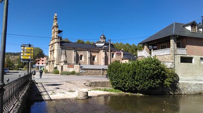 La quasi totalité de cette étape sera le long de la route. Les 2 derniers kilomètres se font cependant sur un chemin descendant vers Villafranca del Bierzo. Je suis alors avec un couple d'Italiens dans la quarantaine, rencontrés quelques kilomètres plus tôt, et qui parlent très bien français. Avant l'entrée du bourg, nous passons devant la massive église de Santiago de Villafranca, dont la construction s'est achevée en 1186. Les photos ne sont pas de moi (source Google).