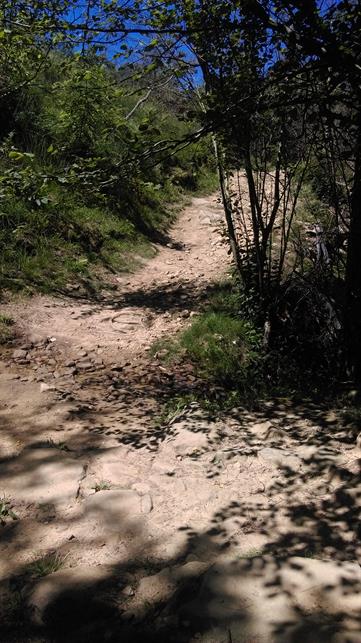 Un peu d'asphalte au début puis des chemins plus ou moins praticables. Certains sont vraiment difficiles, très pentus, avec de grosses pierres inégales très casse gueule. Je me réjouis de n'avoir pas tenté cette étape sous les fortes pluies du 22 juillet.